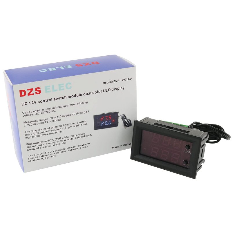 DZS Elec Temperature Controller -50 to 110 Celsius (-58 to 230 F) DC 12V Programmable Heating/Cooling Thermostat Control Switch Module NTC Waterproof Sensor Probe Dual Color LED Display Monitor