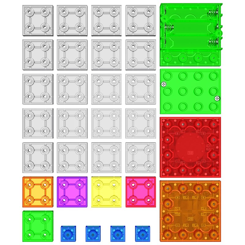 - COMPLETE SET – This building blocks kit includes a voice/sound controller module, color-changing lamp module, battery block, and 25 transparent plastic spacers. The spacers allow for endless possibilities in creating light structures.