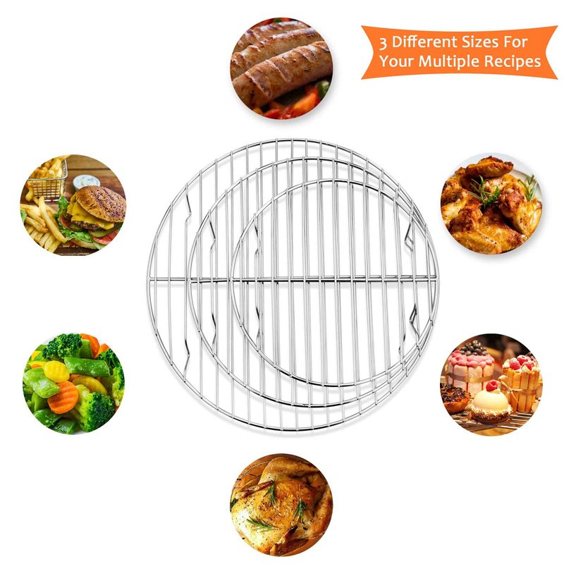 E-far Stainless Steel Round Racks Set of 3 is designed for durability and premium performance. Perfect tool for cooling and baking cookies, pies, and cakes, steaming vegetables and meats, elevating food above the grease, layering food to cook a lot more. Also you can use it as a trivet for hot dishes. To clean up, just simply place it in the dishwasher!