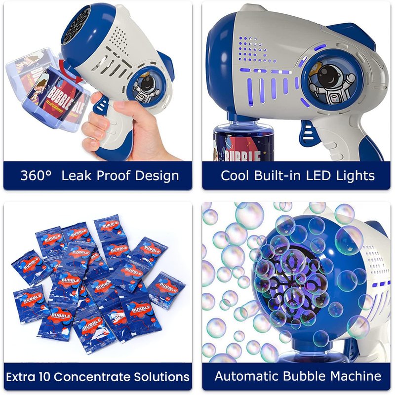 - Cool LED Lights and Customized Astronaut Theme: The bubble toys have shinning LED lights which can glow in dark. Adding tons of fun to the kids bubble games night. Astronaut stickers, spaceship shaped bubble gun can attract kids’ attention more.