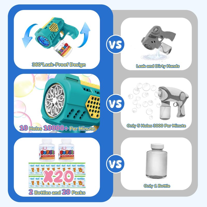 - 【10000+Rich Bubbles Output Per Minute】With a built-in super powerful motor and 10 bubble holes wand, this bubble machine gun churns out over 10,000 bubbles per minute, setting the stage for a mesmerizing spectacle of colorful fun. Kids will delight in the cascade of bubbles, adding an extra dash of joy to their playtime.