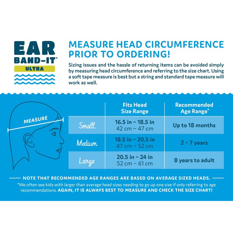 The Ear Band-It Ultra is brought to you by the makers of the Original Ear Band-It headband, the ORIGINAL swimming headband. Developed by a board certified Ear, Nose & Throat Physician and designed to keep water out of the ears, providing maximum comfort and safety while swimming and bathing. After 20 years of development we are proud to introduce the new and improved Ear Band-It Ultra! EXTRA GRIP! Made with a custom inner lining that provides extra grip to avoid slipping off the head. Also made of a much more soft and comfortable neoprene material. Water enthusiasts of all ages will also appreciate using the Putty Buddies earplugs (sold separately) and Ear Band-It Ultra headband in the prevention of swimmer's ear. Size SMALL: Recommended for up to 18 months. Fits head size range 16.5"-18.5" Size MEDIUM: Recommended for ages 2 to 8 years. Fits head size range 18.5"-20.5" Size LARGE: Recommended for ages 9 years to Adult. Fits head size range 20.5"-24" KEEP WATER OUT, HOLD EAR PLUGS IN! Use with your own earplugs and ear molds or with our Putty Buddies soft silicone moldable ear plugs (sold separately). Putty Buddies are the best swimming earplugs on the market.