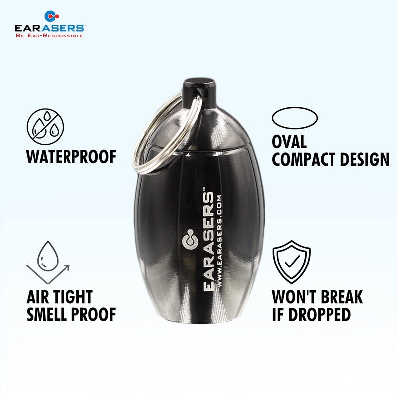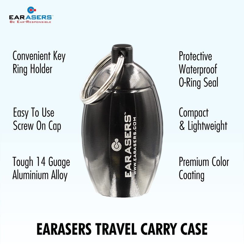 EARasers Earplugs Keychain Carrying Case - Aluminum Waterproof Ear Plugs and Pills Holder (Black)