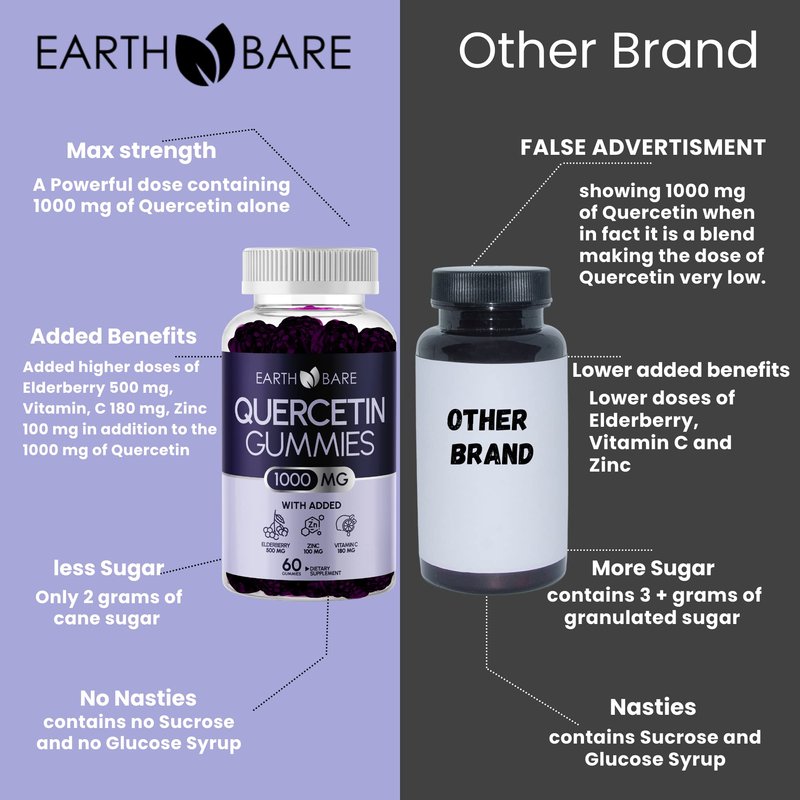 Meet the new star of your natural supplement regimen: Earth Bare Quercetin 1000mg Gummies!Here at Earth Bare, we believe in nothing but the best, and neither should you! Our vision is simple, to empower those who care about their health with the most premium, effective and natural solutions available. We strive to stay on the cutting edge of innovation and research in the health and wellbeing sector, without sacrificing the transparency and integrity that goes into every single one of our powerful little gummies! One thing’s for sure, our Quercetin chewable gummies certainly didn't miss the memo!The optimal ratio of 4 powerful ingredients, curated to serve you...Quercetin, helps to provide excellent immune support, ease inflammation and promote healthy cardiovascular functionZinc, assist in regulating metabolism and may help to provide antihistamine allergy reliefVitamin C, works with Quercetin to enhance bioavailability, further bolstering your immunity Elderberry, packed with antioxidants to fight free radicals and ease environmental stressorsThese Quercetin gummies are the premium solution to your health and wellness needs!Protect yourself and your loved ones with Earth Bare's zinc with quercetin supplement! Quercetin is a dynamic flavonoid found naturally in dark colored fruits and vegetables and although it is readily available, many struggle to meet the quercetin requirements demanded by our environment naturally, so supplementation of this life-changing flavonoid is vital! Introducing our quercetin and zinc gummies, the simple and easy way to reap the benefits quercetin has to offer in an extra strength dosage, for for all the family! What are you waiting for?Earth Bare's Quercetin 1000mg Gummies, you'll be telling your friends where you got yours!