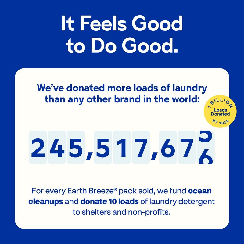- TURN LAUNDRY INTO AN ACT OF KINDNESS: With every purchase, Earth Breeze donates 10 loads of laundry detergent to a variety of charitable causes; Over 280 millions loads donated and counting