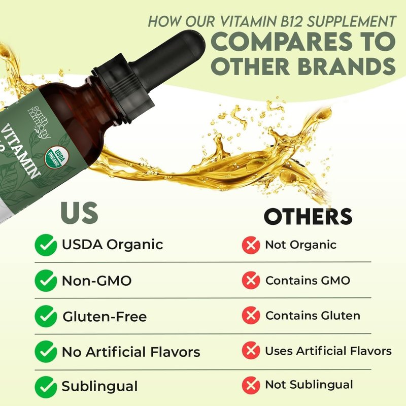 Earth Harmony Naturals Organic Vegan Vitamin B12 Sublingual Liquid Supplement - 2000mcg Methylcobalamin Drops for Natural Energy, Metabolism Health and Immune System Support - 1 Fl Oz