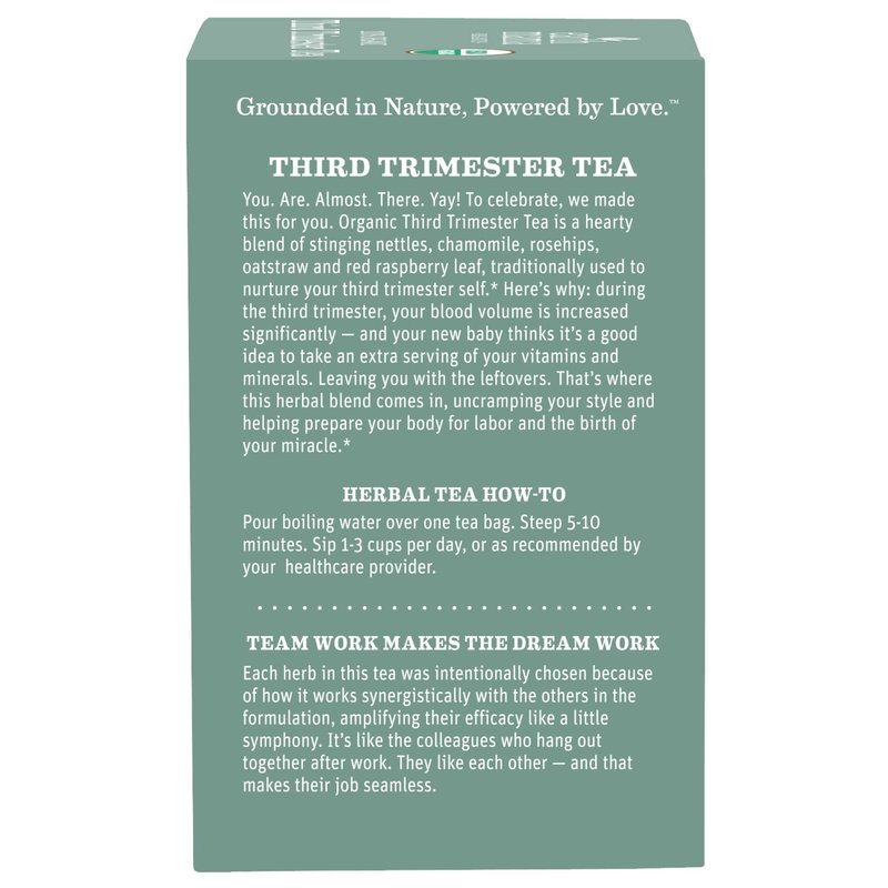 - USDA CERTIFIED 100% ORGANIC: Organic Third Trimester Tea is a hearty blend of stinging nettles, chamomile, rosehips, oatstraw, and red raspberry leaf, traditionally used to nurture your third trimester self and to prepare for labor.*