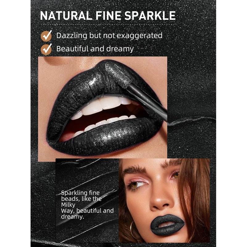 Easilydays Black Glitter Lip Gloss, Diamond Shimmer Lipstick, Metallic Matte Lipstick High Pigment Waterproof Long Lasting Lipsticks, Sparkling Glossy Liquid Lipstick Lip Gloss for Women (#10 Black)