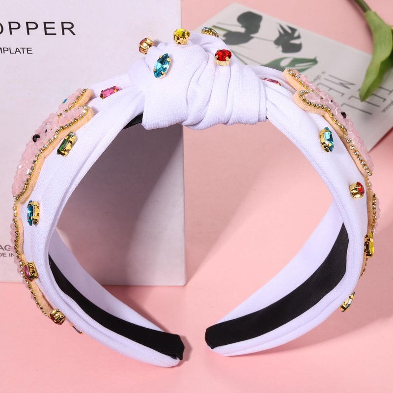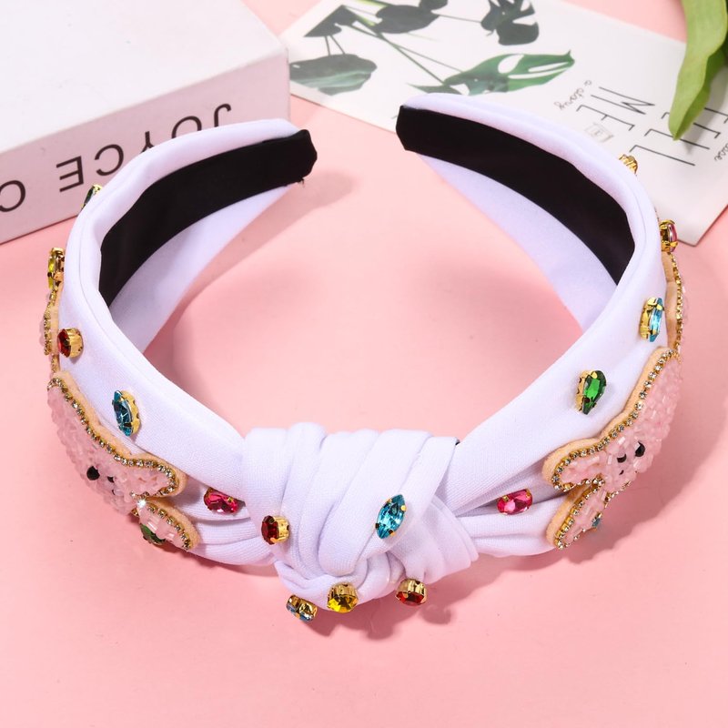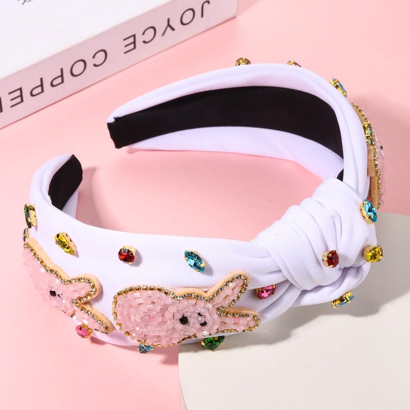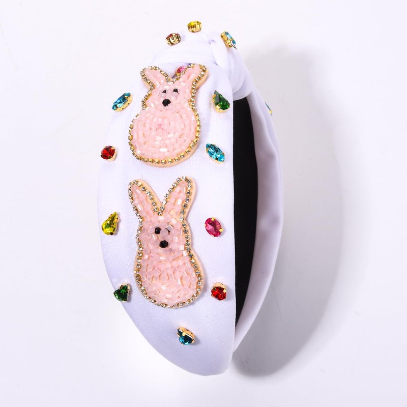 These white pink headbands feature wide top knot design and super cute Easter bunny/egg with bead details, accent with sparkle baroque crystal in vibrant Spring color and elegant pearls, perfect for the upcoming Easter Holiday, whether you're going to church or having an Easter egg hunt.