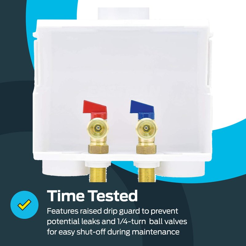 - WHAT IS INCLUDED: The washing machine line box comes complete with (1) pre-installed support bracket, (1) faceplate cover, and (2) 1/4-turn ball valve