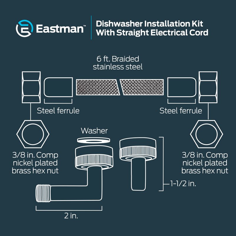 Eastman Dishwasher Installation Kit, 6 Foot Supply Line, 3/8 Inch x 3/8 Inch Compression, 6 Foot 3-Prong Straight Power Cord, Braided Stainless Steel Dishwasher Connectors, 41150