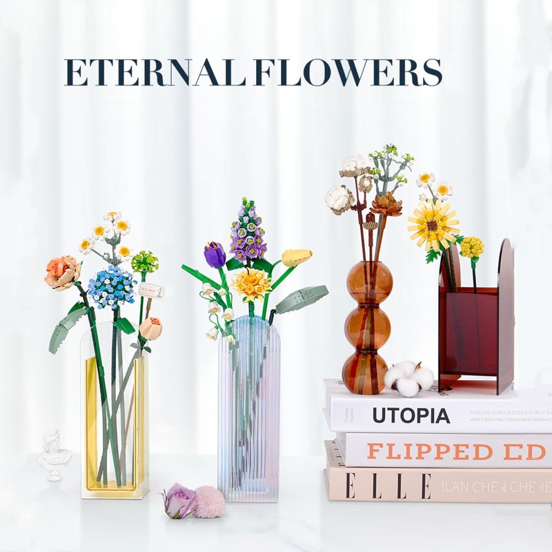 - ♚ Bouquet Flower - A charming set of immortal flowers composed of 646 pieces of building blocks, with rich colors, interesting shapes, and full of romantic beauty and vitality. Unique design allows you to position petals and leaves, change the length of stems, and create wonderful arrangements suitable for any occasion. These immortal flowers are perfect for giving to loved ones or for showcasing at home, making them a must-have for any flower enthusiast. It will not deform or fade.