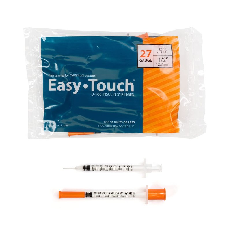EasyTouch U-100 Insulin Syringe with Needle, 27G 0.5cc 1/2-Inch (12.7mm), Box of 100
