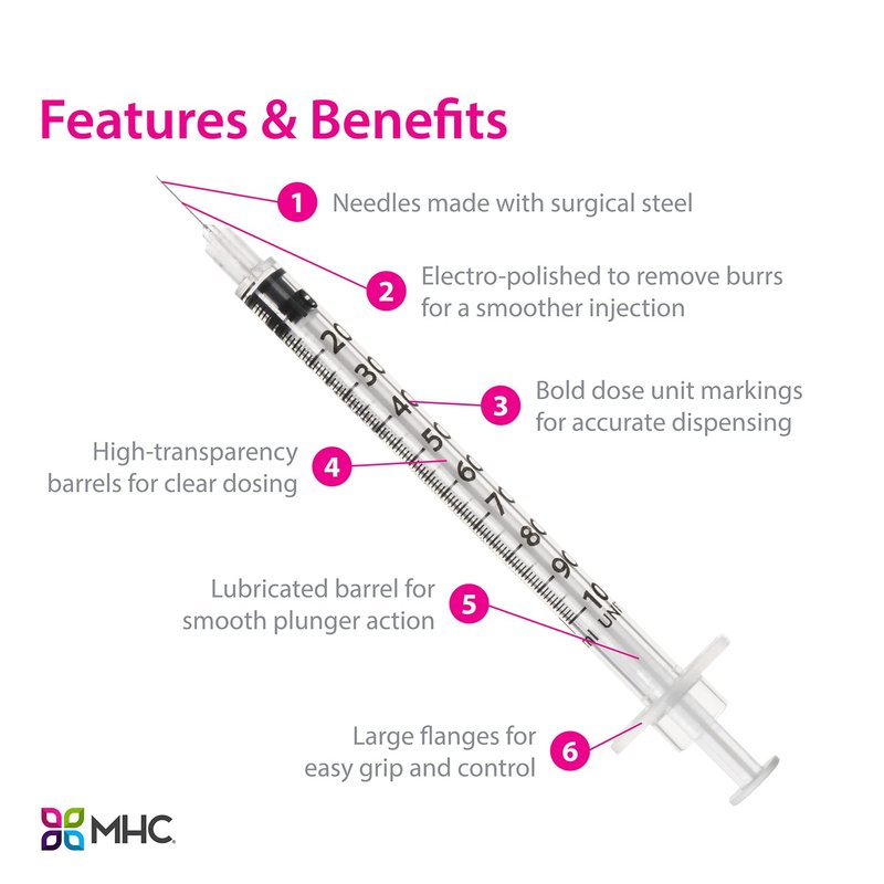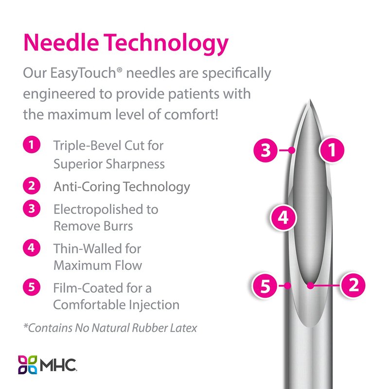 Easy Touch Syringes are coated in a film for maximum comfort and they line up precisely for accurate and reliable readings. Not only that but these Each Touch products are latex-free. The needle is made of surgical grade stainless steel and is securely attached, thereby eliminating the worry of the needle popping off. This high-quality product also has a protective plunger cap designed to keep the needle sterile during shipping.