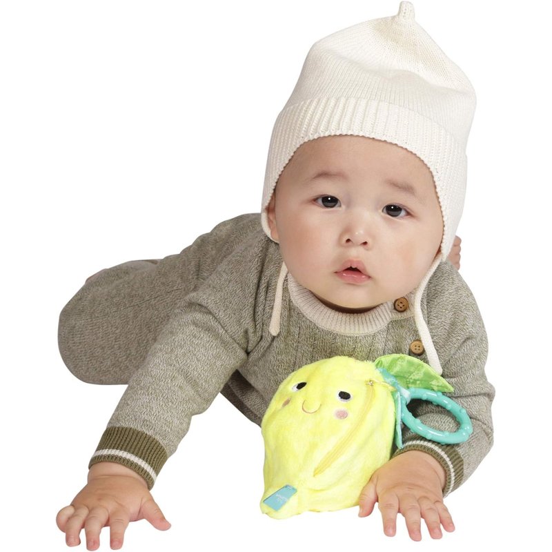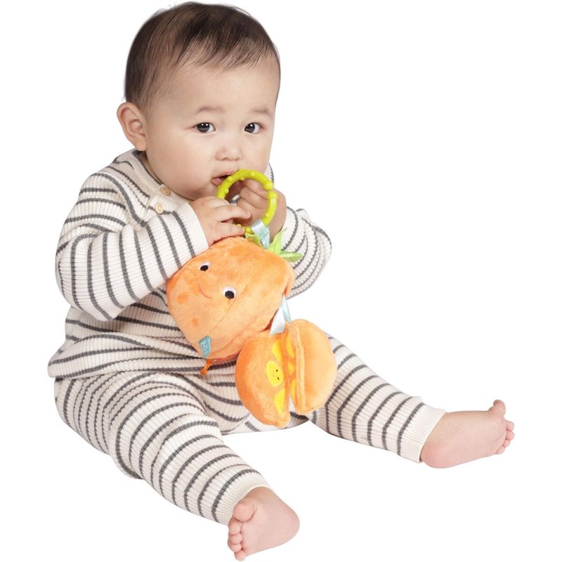 - Fruity fun for little ones; Orange and Lemon Take Along Toys have embroidered facial features and soft fabric fruit slices. Tethered by silky-soft ribbons, each slice includes unique features - rattle, squeaker and crinkle textures. With multiple textured fabrics, silky leaves and interior lining, they easily attach to carriers and more with their textured plastic C-clip that doubles as a teether. Great for on-the-go play while encouraging motor development & cause and effect learning.