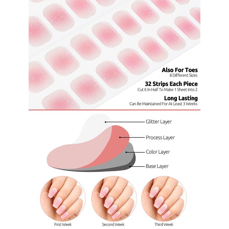 <b>New Style about Cured Gel Nail Strips Wraps:</b><br> Made of real gel nail polish ingredients cured (or finalized) by 60%;<br> One third of the cost of a nail salon would get the same gel nail effect;<br> Easy to use, cured by UV lamps. (Note: Items not included UV lamps.)<br> Can last for about 3 weeks like nail art salon.<br><br> <b>Package Includes:</b><br> 2 x nail gel strips pack (16 strips/pack)<br> 1 x nail file<br> 1 x wood stick<br><br> <b>Use and Remove:</b><br> 1.Clean and smooth your nails (Package include nail file);<br> 2.Choose the correct size nail wraps, peel off the protective films of the Gel Nail.<br> 3.Place and stick on the fingernails gently.<br> 4.Use a wood stick to press and flatten the edges of the nails.<br> 5.Cut the excess nail wraps stickers with a nail clipper.<br> 6.If it is not flat, use a wood stick to press again.<br> 7.Cure the gel nails under UV/LED light. (1-2 minutes)<br> 8.Then smooth the edges with a nail file. Done!<br> Remove: Use the wood stick to lift gel nail wraps off your nails.<br><br> <b>Warm Tips:</b><br> 1.Recommended to use a regular (not gel) clear topcoat to provide shine to your nails.<br> 2.Ensure that any remaining nail wraps are stored back into the foil bag to avoid drying out.<br><br>