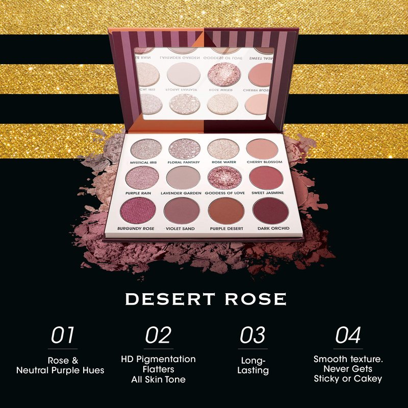 - [DESERT ROSE] Bring a floral utopia with highly pigmented dusty purple and romantic rose shades with gel shimmering pearl shades. The pressed glitter included in the palette give a multi-dimensional effect. Prefect for subtle, natural looks to dramatic statements.