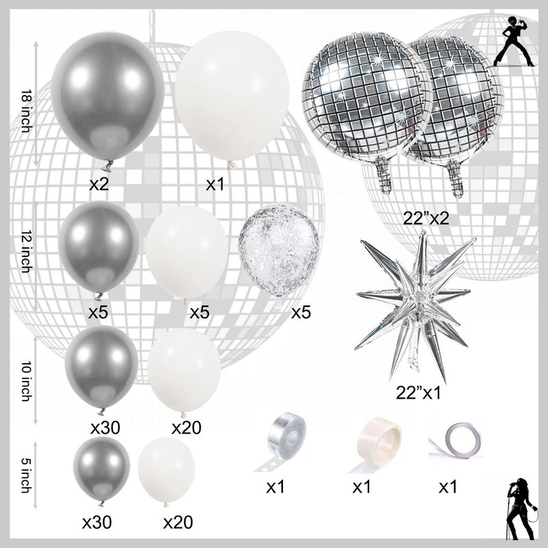 • Disco-Themed Celebration: Our ECEAE 124-piece balloon set is perfect for creating a vibrant disco atmosphere. Including matte white, metallic Chrome silver, and transparent confetti balloons, 2 large Disco foil balls and 1 star burst foil balloon it brings a dazzling effect to any party.