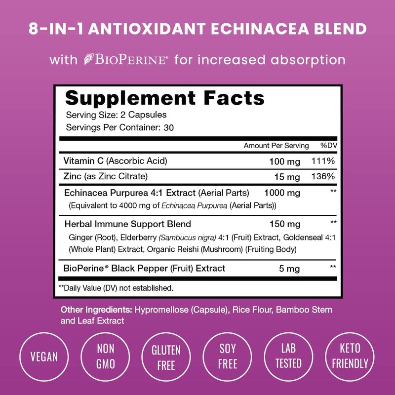 - Immune Support & Seasonal Protection - NutraChamps Echinacea Pills consist of several potent herbs to target and protect many systems throughout your body. A herbal shield for your body during cold, allergy, and year-round seasons.