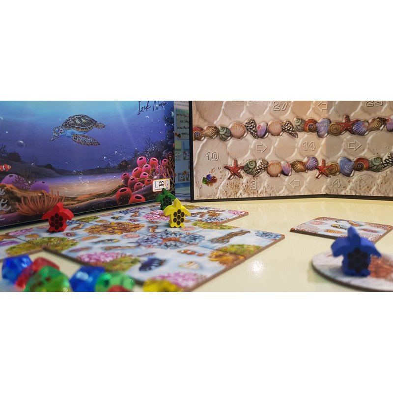 - The ECO Coral Reef game is for 2-4 players, with a playtime of 30-60 minutes. The game contains 60 cardboard tiles and accessories such as 1 scoreboard, 4 turtle meeples, and 8 gems.