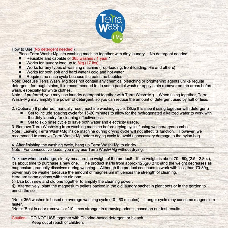 - [ How to Use ] Easy to use! Just throw in a washing machine along with your clothes and do the regular washing cycle. No more measuring, spilling, and buying heavy bottles! After wash, just air dry. 1pc of Terra Wash +Mg can work up to 17.6 lbs (8kg) of clothes per wash, so having large machine with more clothes, use 2 ore more.