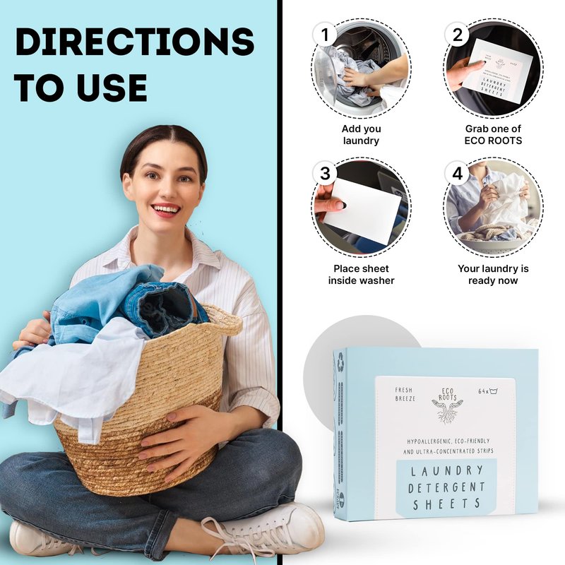 ECO ROOTS Laundry Detergent Sheets 64 loads | ECO FRIENDLY Natural Fresh Breeze Scent Washer Sheet, Liquidless Travel Size Laundry Strips Detergent, Zero Waste Sheets Plastic Free Sustainable Products