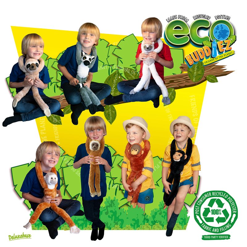 EcoBuddiez are the super soft and cuddly range of plush toys from Deluxebase! Our fantastic toy stuffed animals are made from recycled plastic bottles to help conserve and protect our environment. These soft toys make the perfect Christmas or birthday gift and are ideal for improving any kids play time! The animals in the EcoBuddiez hanging range include: - Chimp - Gibbon - Orangutan - Pink Squirrel Monkey - Purple Squirrel Monkey - Ring-Tailed Lemur - Sifaka - Sloth - Squirrel Monkey. Find your favourite or collect them all! Check out the other Deluxebase environmentally friendly EcoBuddiez Ranges including the Classic animal plush in 3 sizes and Sssnakes snake themed soft toys!