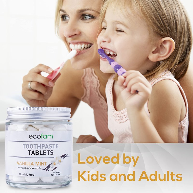 EcoFam toothpaste features a chewable, waterless design that allows you to brush your teeth anywhere, anytime, without carrying bulky toothpaste tubes. To use, place one tablet in your mouth and crush it with your teeth. Wet your toothbrush and brush your teeth for about 2 minutes. The paste will foam slightly as you begin to brush. Rinse thoroughly and enjoy your bright, healthy smile! Available in Peppermint, Vanilla Mint, Wintergreen, Cinnamon, Bubble Gum, and Strawberry Kiwi Made with Nano Hydroxyapatite and xylitol.