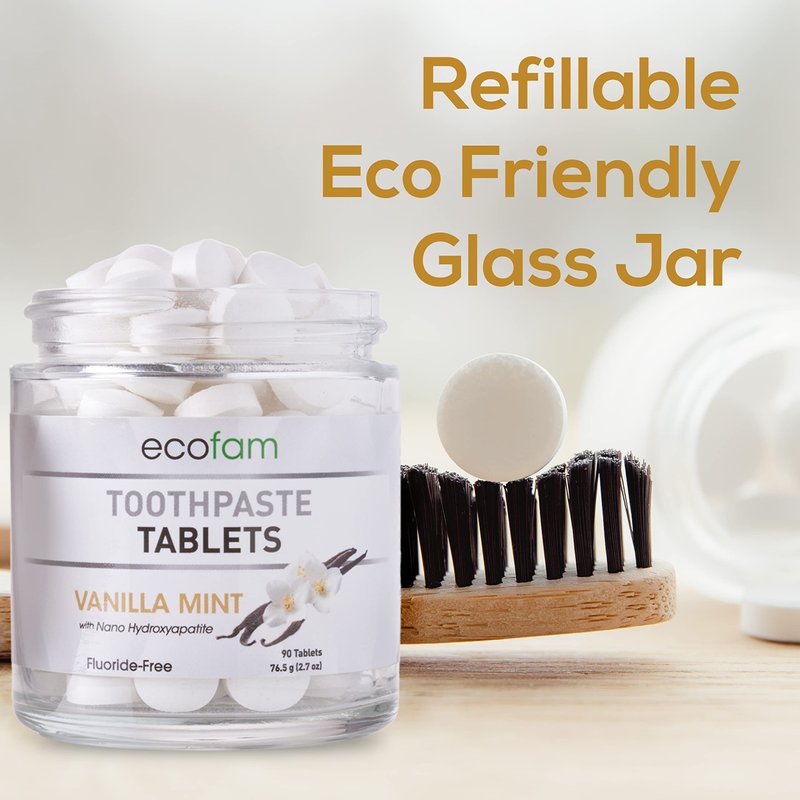 - Contains zero plastic! Our toothpaste tablets are packaged in an eco friendly glass jar that can be reused or refilled or recycled and eliminate extra packaging waste.