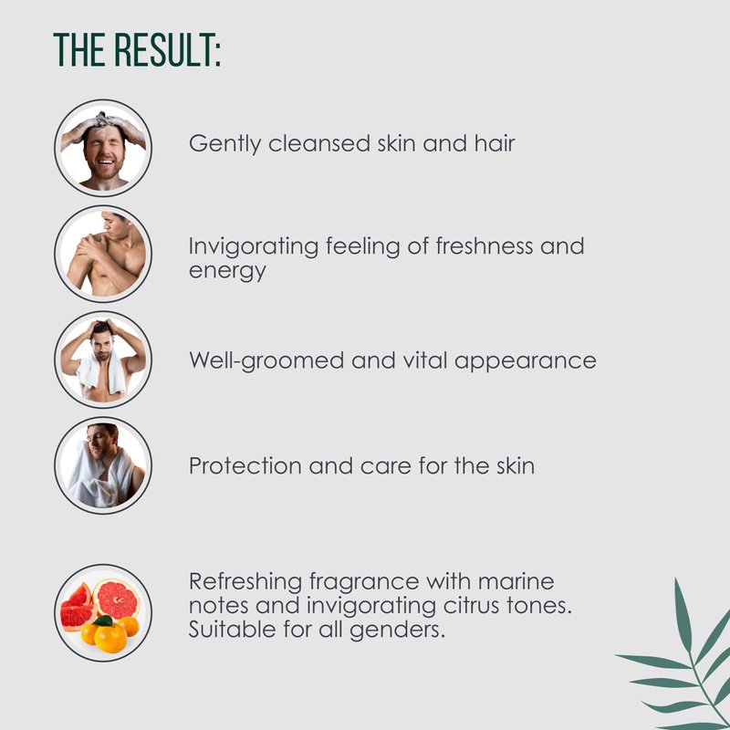 - Energizing Cleanse: Shower Gel & Shampoo men, enriched with green tea extract, tones & refreshes skin while offering gentle cleansing for both body and hair, providing an energizing start to your day.