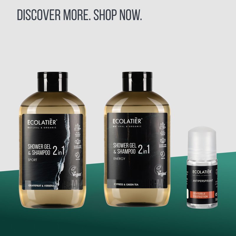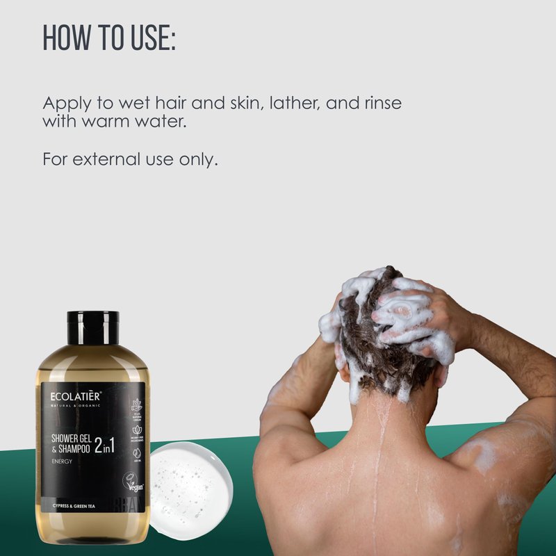 Shower Gel & Shampoo 2-in-1 Energy by ECOLATIER URBAN is the ideal mens body wash and shampoo men for active lifestyles. Formulated with 97.5% natural ingredients, this energizing 2-in-1 mens shampoo and conditioner 2 in 1 delivers effective cleansing and skin care in one step. This vegan-certified and cruelty-free product is perfect for men who care about sustainable grooming. Enriched with Green Tea Extract, a natural antiseptic, it awakens your skin, improves cellular metabolism, and provides toning and moisturizing effects. Cypress Oil adds deodorizing and stress-relieving properties, ideal after a tough workout or busy day, uplifting your mood and easing nervous tension. This mens shampoo and body wash also includes Croton Lechleri Resin Extract (Dragon’s Blood) and Moringa Extract, known for detoxifying and regenerating the skin. Combined with essential vitamins B5, B6, C, and E, it promotes skin regeneration, antioxidant activity, and strengthens the skin barrier. These ingredients care for both your hair and skin, leaving them clean, nourished, and protected. The Shower Gel & Shampoo 2-in-1 Energy provides long-lasting freshness, keeping you clean and hydrated throughout the day. Whether starting your morning, recovering after exercise, or unwinding after a busy day, this natural body wash for men keeps you feeling energized and refreshed. This hair regrowth shampoo for men offers a natural, chemical-free grooming solution that saves time without compromising quality. Ideal for daily use, it gently cleanses and rejuvenates your skin and hair, maintaining a fresh, youthful look. With its blend of natural oils and extracts, it’s perfect for men who prefer multi-functional products. Whether it enhances your morning routine or helps you wind down, the ECOLATIER URBAN Men Shower Gel & Shampoo 2-in-1 Energy offers a complete shower experience.