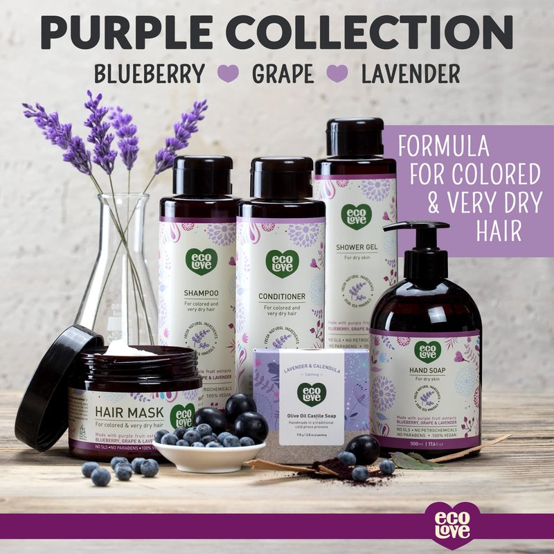 - NATURAL & ORGANIC INGREDIENTS: ecoLove Purple Collection Conditioner is free from SLS, parabens and petrochemicals. 95% nature-derived ingredients (30% organic). Enriched with essential oils, organic herbs & plant extracts and 26 Dead Sea minerals. Relaxing lavender scent