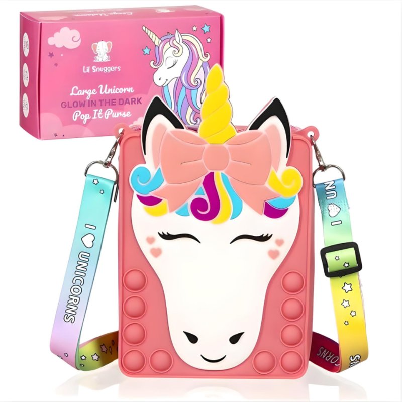 Ecomerr Unicorn Pop Purse, Glow in The Dark Crossbody Shoulder Bag with Adjustable Strap & Strong Zipper, Sensory Toys Party Favors, Birthday Gifts for Girls, Stress Relief Toy - 5.4x3x7”