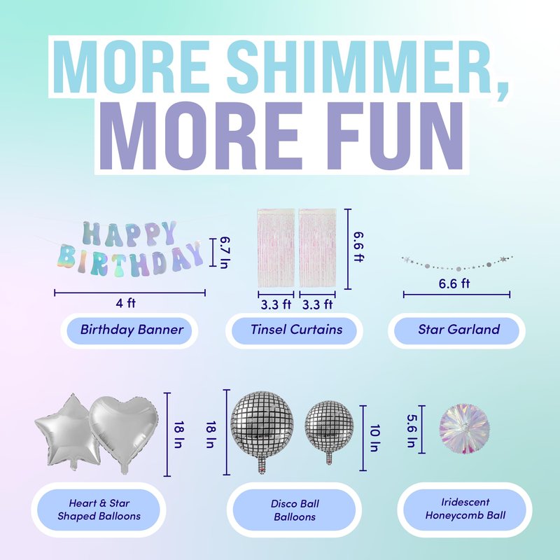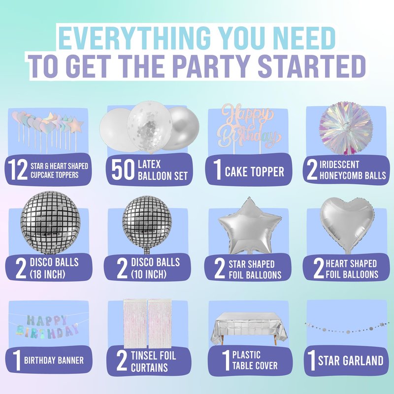 Set. Whether it's a birthday party, bridal shower, or baby shower, this all-in-one party decor set for both kids and adults will bring the perfect sparkle and groove to any occasion. Our birthday decorations package includes everything you need to wow your guests, from a stunning Happy Birthday banner to dazzling disco ball decor. This set of birthday party decorations features sparkling disco ball balloons in 18-inch and 10-inch sizes, along with star balloons, heart balloons, and iridescent balloons to enhance your disco backdrop. You’ll also find a plastic table cover and tinsel curtain for extra shine! Add a retro touch with the included cupcake toppers, cake toppers, and a 50-piece latex balloon set featuring white balloons, silver balloons, and confetti balloons. Elevate your party with additional iridescent party decorations like honeycomb balls and a sparkling star garland. This versatile disco party set is perfect for any birthday party, disco party, or fabulous bridal shower. Bring the retro vibe to life with these complete party essentials and create a celebration filled with groovy memories! With the ecoZen Disco Party Decorations Set, your next event will shine with style and make every moment unforgettable.