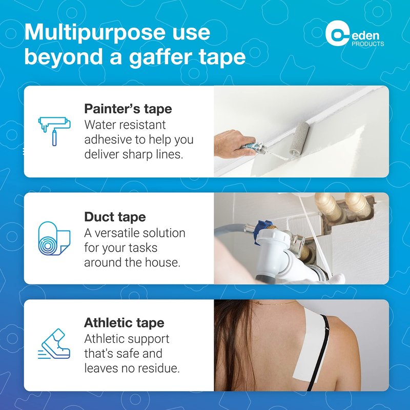 - ESSENTIAL FOR ANY HOME – The great thing about gaffer strips is it can be used to replace other tapes, like electrical tape, athletic tape, hockey tape, duct tape, painters tape, it can be used on carpet, bricks, body skin, camera, photography gear, production equipment, walls, wood floor, concrete, bookbinding, art, metal, securing computers and TV, and even for windows and doors to prevent drafts, vent accidental trips, falls, and equipment damage due to loose cords while leaving no residue.