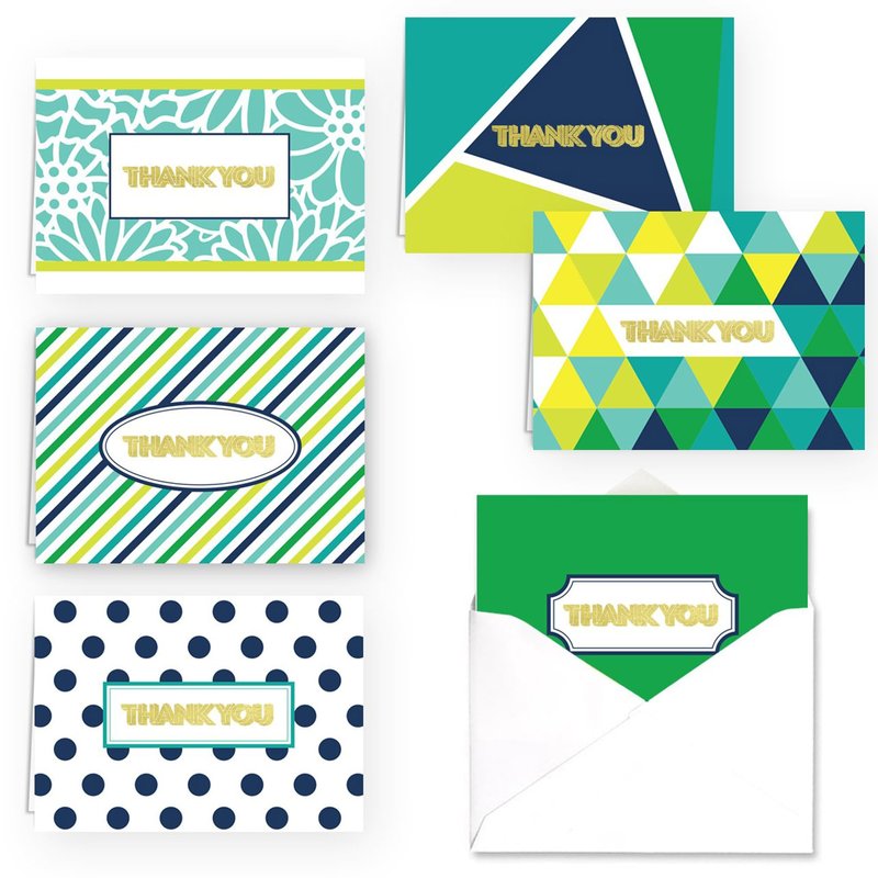 - Designs: 6 edgy colored thank you designs with shiny gold foil accents. There are 6 cards of each design. Cards are blank inside for plenty of space to write your own gratitude messages.