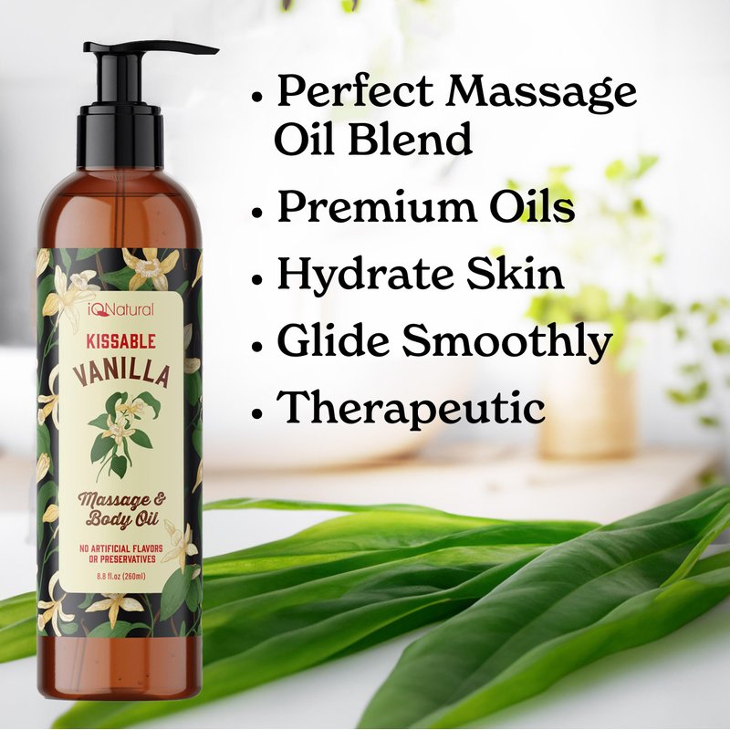 IQ Natural Massage Oil for Massage Therapy - Coconut, Sunflower and Edible Vanilla Sensual Body Oil, Massage Oil for Couples Body Massage - 8 fl oz