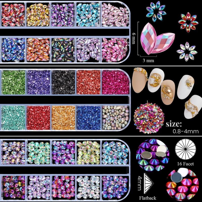 - Horse eye rhinestones and 16 facets rhinestones nail accessories: The horse eye rhinestones have 12 rainbow colors, glittering and shining. 16 facets rhinestones drill is punk style, can be applied to just about any surface, including fabric, plastic, metal and so on. They are flat back and well made, easy to decorate your nails.