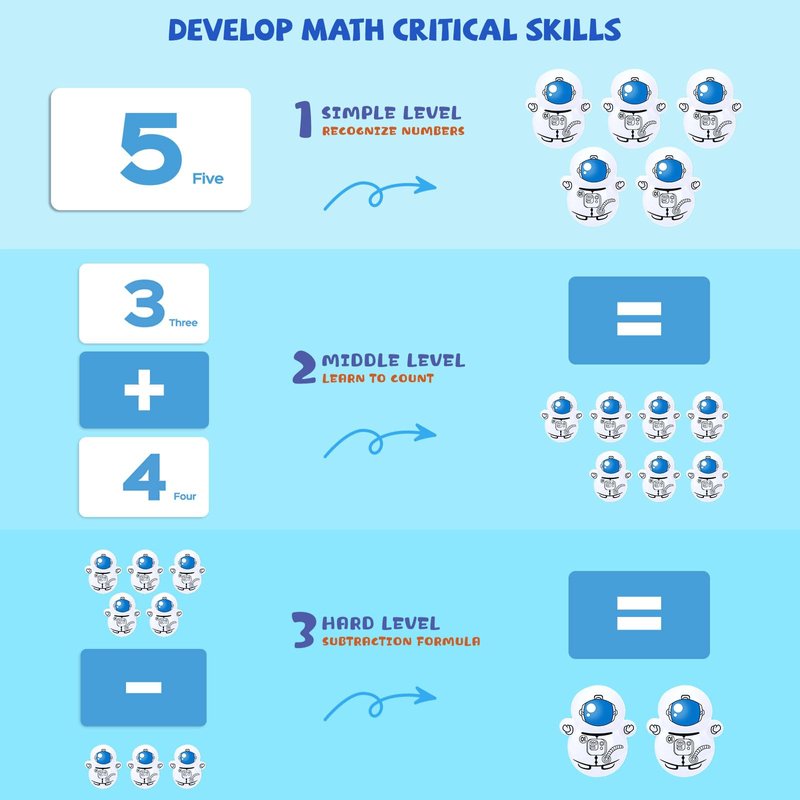 Number Cards: The toy comes with a set of number cards, each card displaying a number and several math problems.