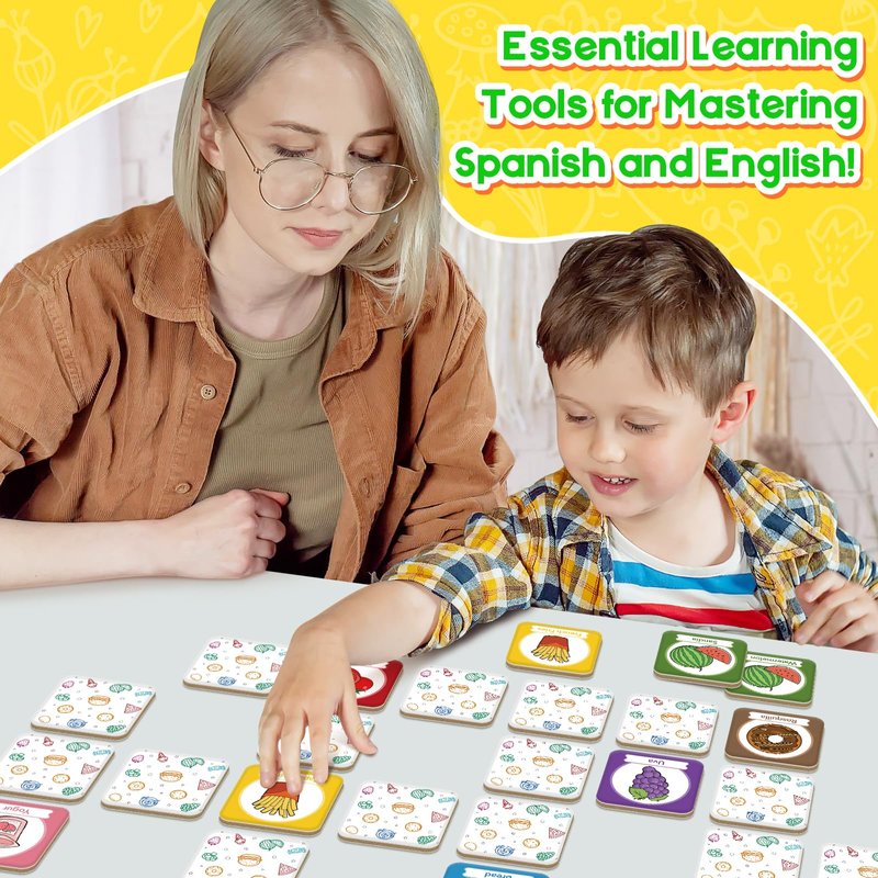 - Fun and Interactive: This bilingual matching card game features 28 pairs of cards, providing a fun and effective way for kids to learn Spanish while matching simple words.