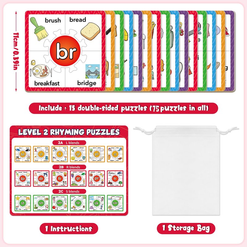 - Contents: It is divided into 4 levels according to the teaching content: Level 1: Short Vowel Blends; Level 2: Consonant Blends & Digraphs; Level 3: Long Vowels, Silent E, Bossy R, and Diphthongs; Level 4: Trigraphs, Alternative Letters, Common Endings, and Silent Letters. This rhyming puzzle set is great for young children learning basic words and pronunciation.
