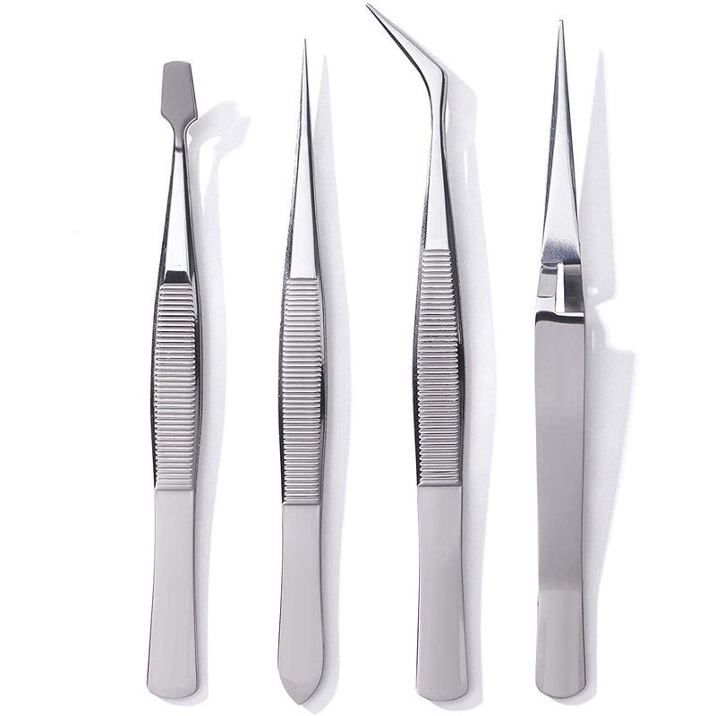 - 4 Piece Set includes slant tip tweezers, point tip tweezers, round tweezers and reverse action tweezers