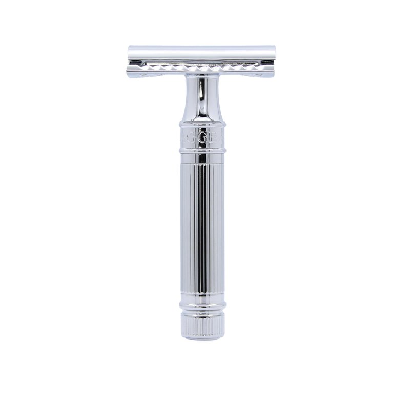 - Premium Quality: Machined from solid brass, triple-plated, hand-polished and finished in a chrome lined effect, ensuring improved wet grip and precision control. This classic men’s razor offers a comfortable, barbershop quality shave - every time.