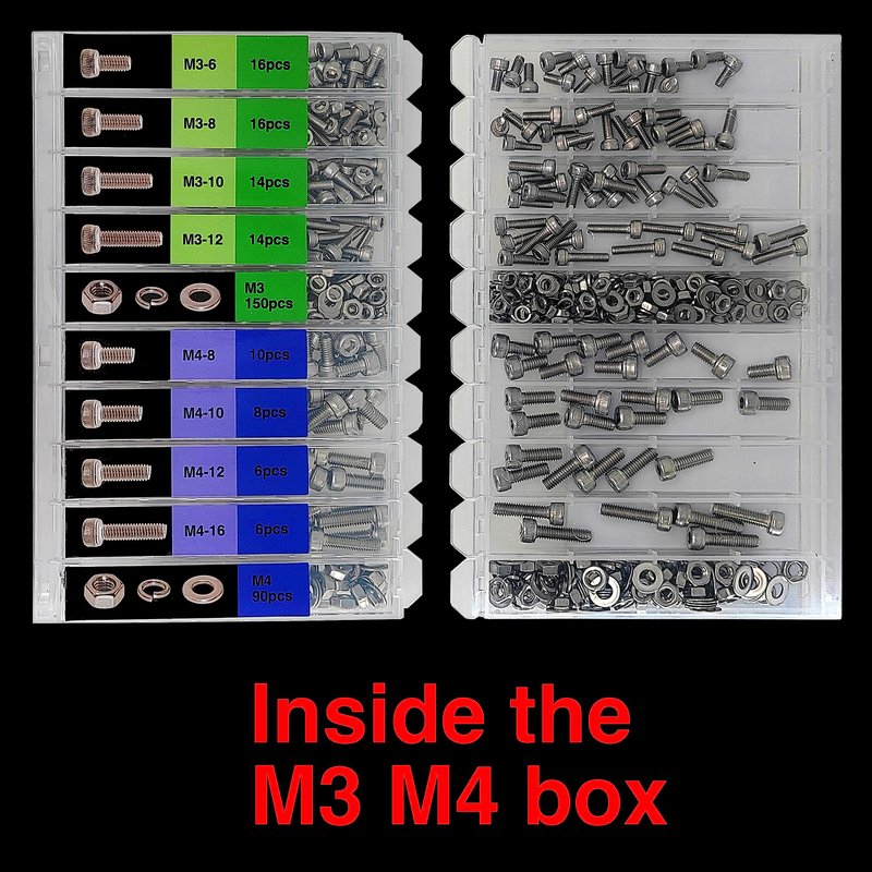 - 🟢 M3: 6mm 8mm 10mm 12mm with M3 Washer nut and spring washer 210pcs 🔵 M4: 8mm 10mm 12mm 16mm with M4 washer nut and spring washer 120pcs