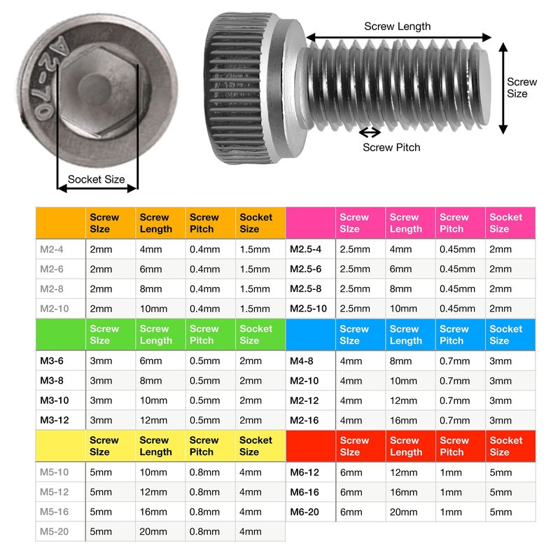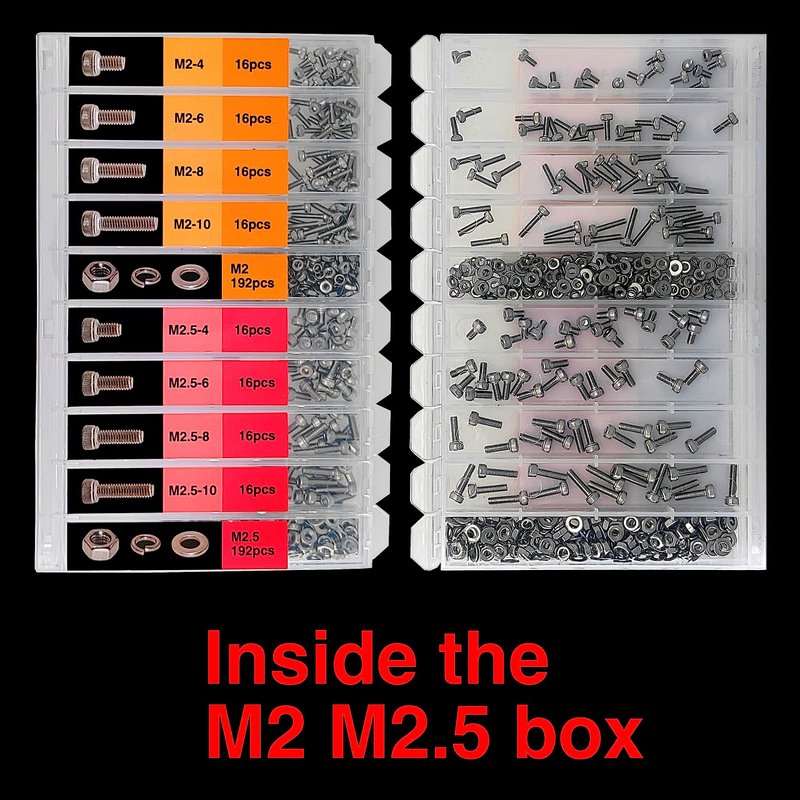 - 🔘 M2 M2.5 M3 M4 M5 M6 982pcs Hex Socket Head Cap Screws and nuts assortment. Individual slots with their own descriptive lids