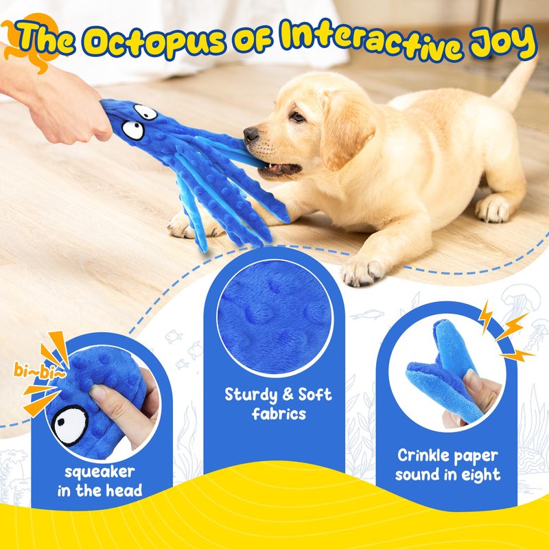 - Interactive Must-Have:Our versatile octopus plush toy is a two-in-one entertainer, complete with a squeaky head and crinkle paper sounds.Suitable for fetching and tugging, easy for pets to carry, toss, and roll, making it great for playing time fun