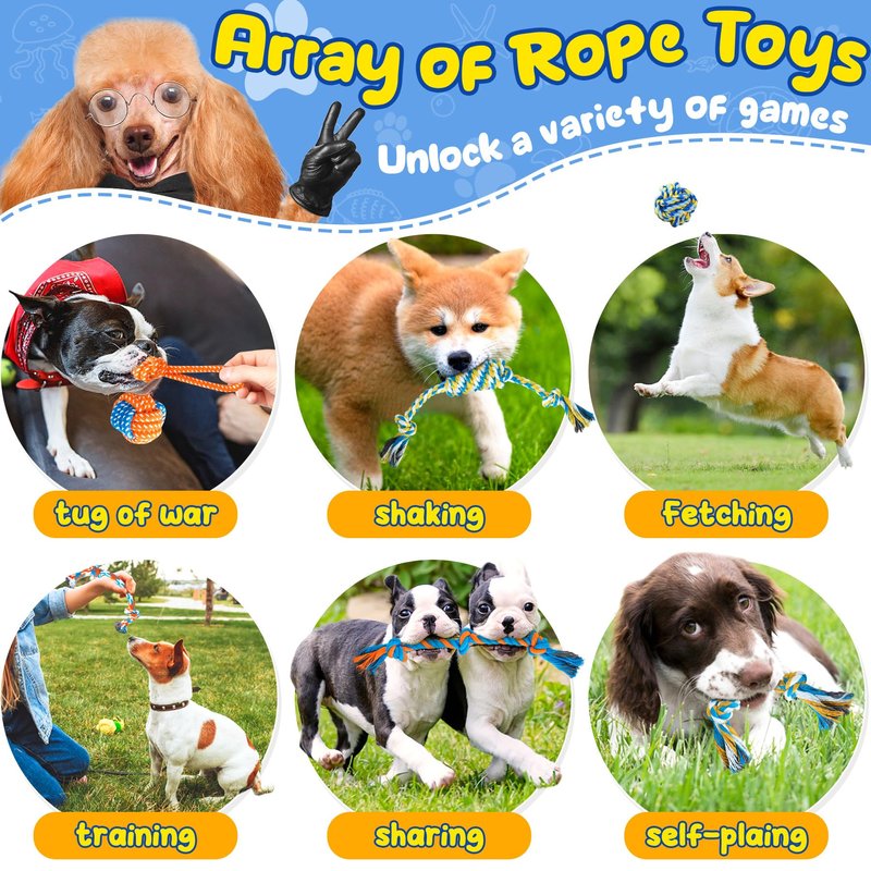 - Versatile Toys:Our rope toys are suitable for tug-of-war, fetching, and tossing. The treat ball enhances pup's intellect by dispensing treats when rolled, and squeaky toys attract puppies with a gentle press.This set offers varied entertainment options