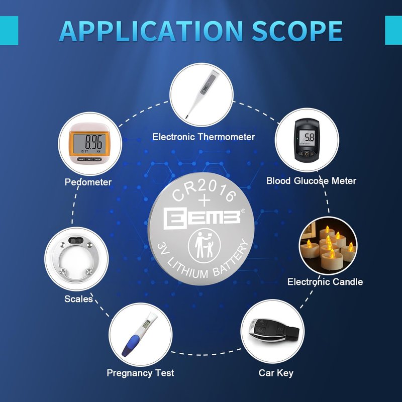 - APPLICATION—EEMB CR2016 batteries for car key FOBs, watches, calculators, garage door openers, toys, LED lights, games console, MP3 players, digital voice recorders, remotes, door chimes, sporting goods, calorie counters, stopwatches, glucometers, pet collars, personal weighing scales and many other devices.