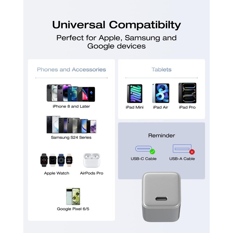 - Wide Device Compatibility: Designed to work seamlessly with a wide range of devices, including iPhone 15 and older Series', various iPad models, AirPods, and Apple Watch. This versatile charging block is also compatible with many Android smart phones including Samsung Galaxy and Google Pixel, making it an all-in-one solution for your tech.