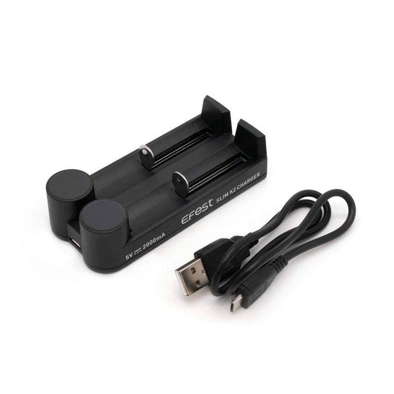 2-Bay Slim K2 USB Battery Charger with LED Indicator by Efest Charge up your spare batteries with the Efest Slim K2 USB Battery Charger. This charger has 2 battery ports with convenient LED indicator lights. Offering three charging modes (speeds), this charger quickly powers up your batteries, automatically shuts off when your batteries are fully charged, and auto-recharges when your battery’s voltage is less than 4.05v. The Efest Slim K2 USB Battery Charger is made from piano springs and spring-tested for quality. It features reverse polarity and short circuit protection.